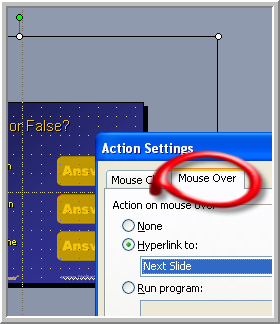 How to Hyperlink to the Last Slide Viewed Plus One PowerPoint provides the command to "Return to the last slide viewed" which can be very useful. Sometimes though you really want to return to the slide AFTER the last slide viewed. A typical example would be following a "Well Done!" slide you want to go to the NEXT question in a quiz. There is no built in way to do this but it can be deviously achieved! Create the slide to hyperlink to and from as you normally would. Have button or shape on the slide to hyperlink FROM which links to "Slide ..." and a button / shape on the slide hyperlinked TO that links to "Last slide viewed". Now on the first slide add a rectangle with no line and a 99% transparent fill. This shape will be invisible. In action settings give this shape a MOUSEOVER action of "Next slide". To be absolutely sure the method works make this shape as large as possible, stretching it beyond the slide boundaries (a 25% view helps). Now add an entrance animation of "Appear" to this shape. Double click the entry and in "Timing" set a trigger - "Start effect on click of ..". Choose the hyperlink button / shape as the trigger. When you click the button / shape you will hyperlink to the chosen slide BUT the invisible shape will also appear. As soon as you return the mouseover hyperlink will take you to the following slide!